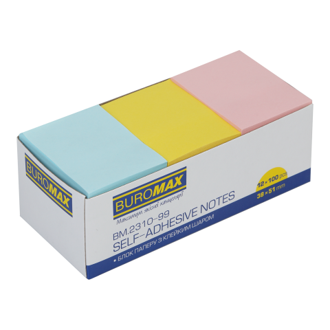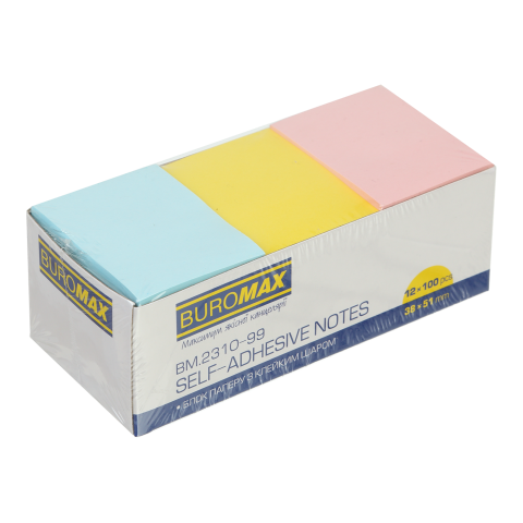 - Упаковка: 12 блоків в кольорах асорті (кожний колір: 3 блоки по 100 аркушів) в картонній коробці