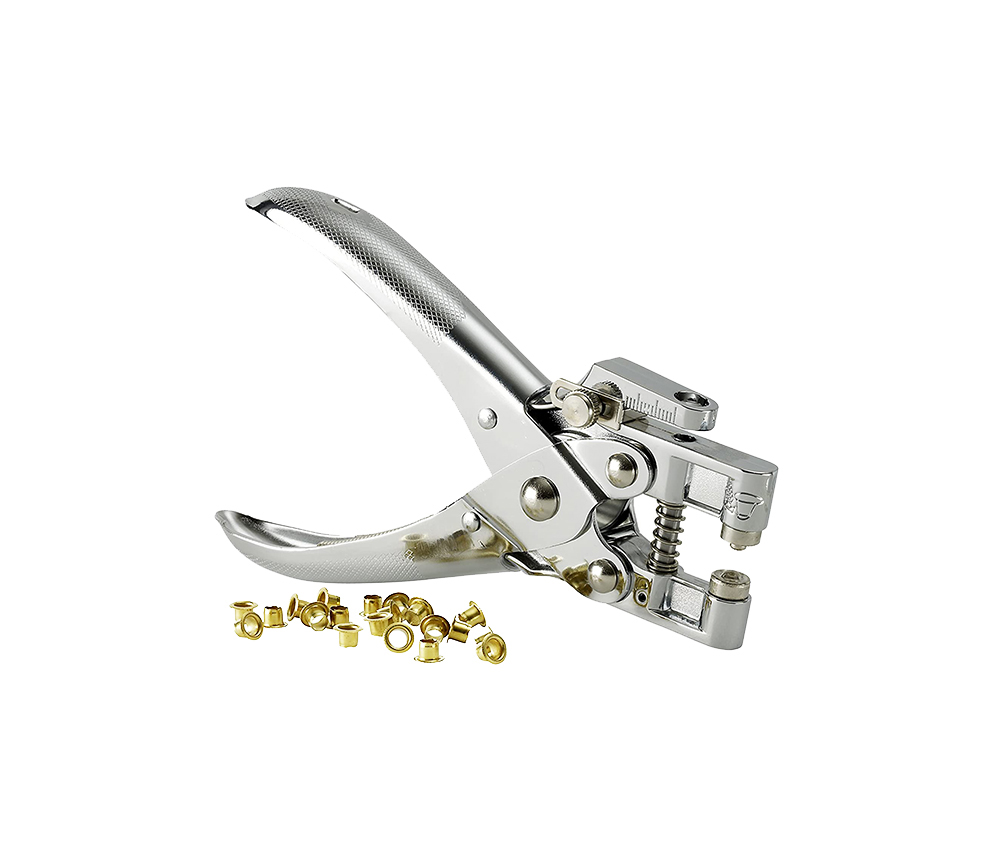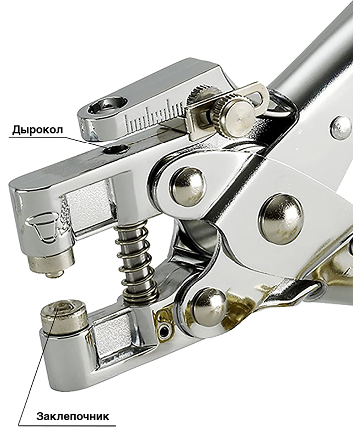Конструкция состоит из ручек, установочной шкалы, губок с выступами для крепления люверсов и металлического стержня, на котором крепится возвратная пружина.