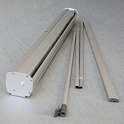 — рекламное поле банера скручивается в корпус стенда при сборке,