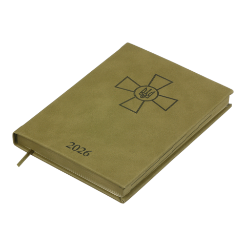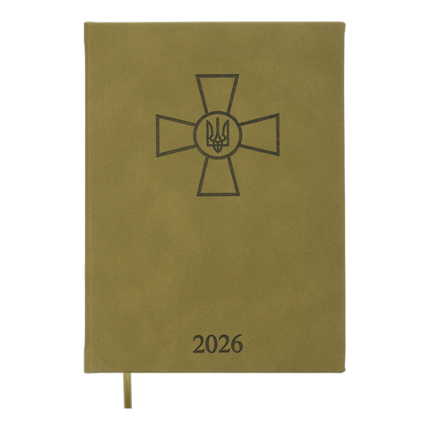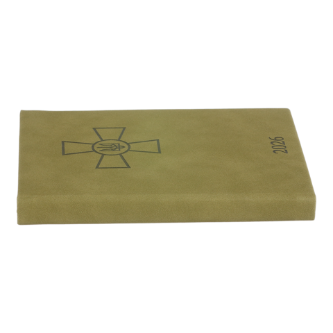 Жорстка обкладинка з гладкої штучної шкіри з поролоном щоденника FORCES виконана у витриманому та мужньому стилі з військовою тематикою — оздоблена сліпим тисненням Хреста ЗСУ. Гармонійно доповнює дизайн щоденника тонований в колір обкладинки зріз внутрішнього блоку та сліпе тиснення року.
