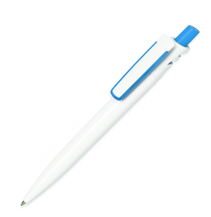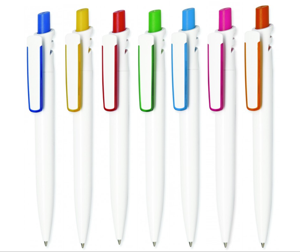 Пластиковая автоматическая ручка с шариковым стержнем синего цвета. Цветовой ассортимент представлен 7-ми яркими цветами.