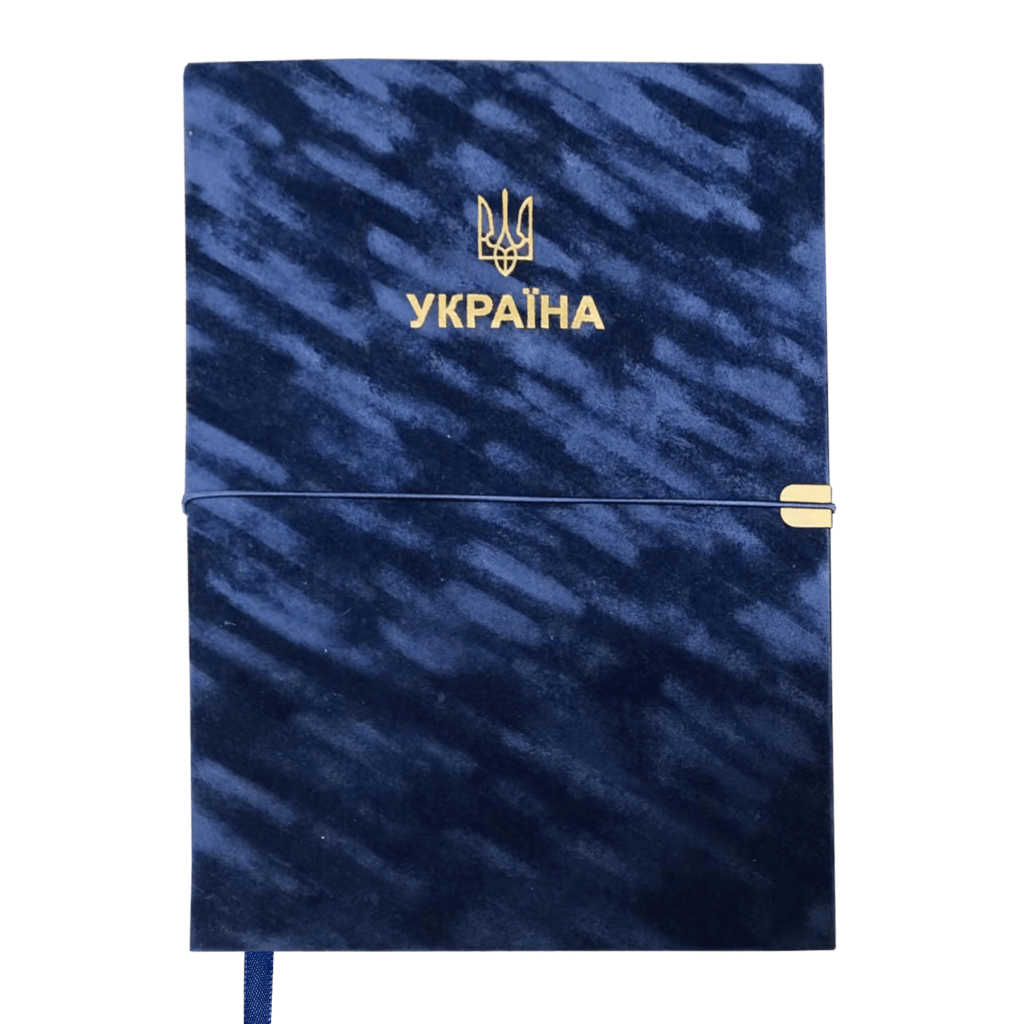 Гнучка обкладинка зі штучної шкіри з інтенсивним бархатним покриттям щоденника PATRIOT VELOUR виконана у розкішному стилі з національною символікою – украшена тисненням Тризуба та напису УКРАЇНА золотою фольгою. Дві функціональні шильди на лицьовій та зворотній стороні обкладинки з поглибленнями для поперечної резинки забезпечують зручну та надійну фіксацію щоденника в закритому стані. Гармонійно доповнює та збагачує дизайн щоденника тонований золотом зріз внутрішнього блоку з нанесенням року.