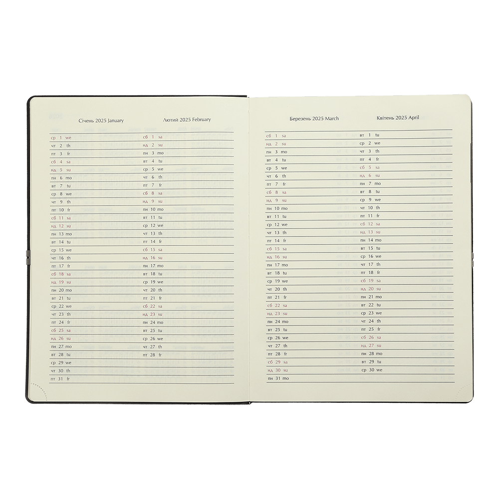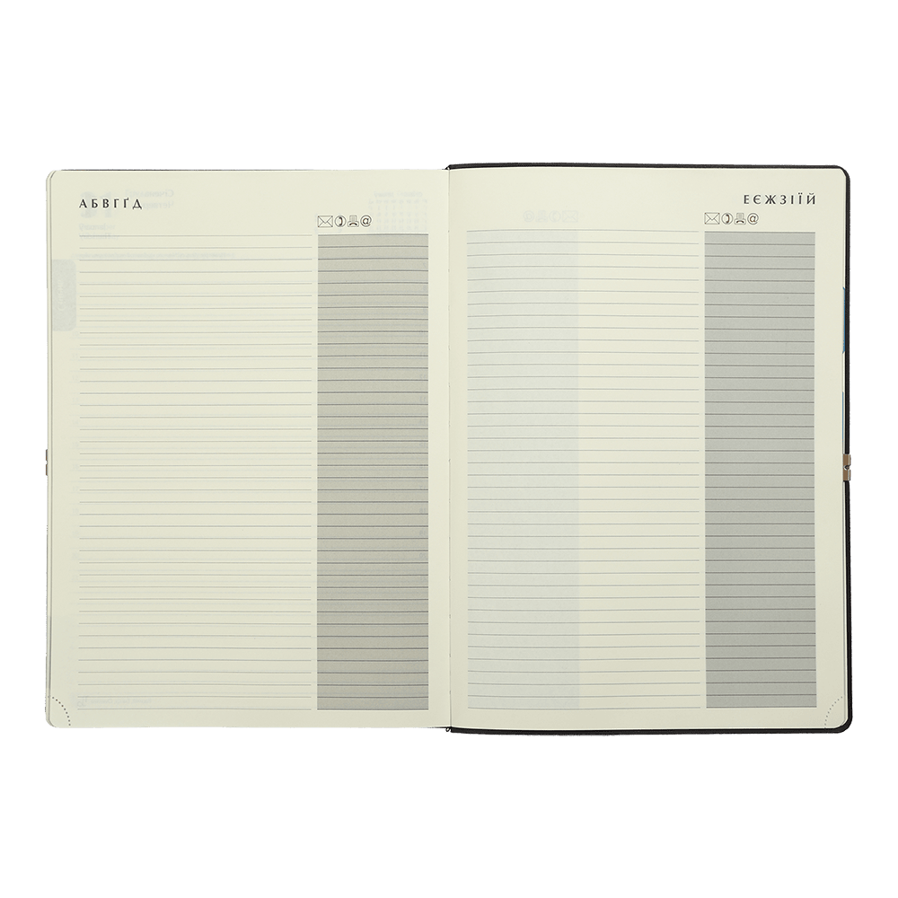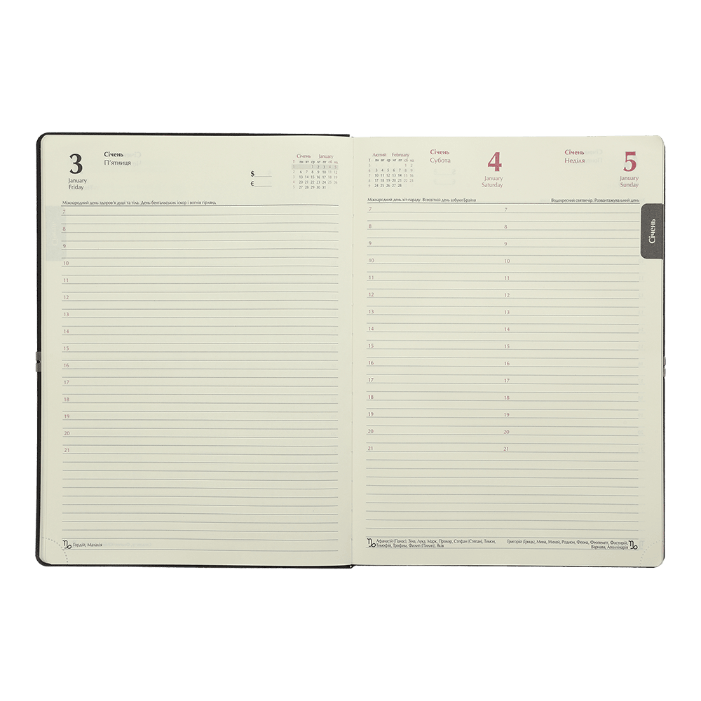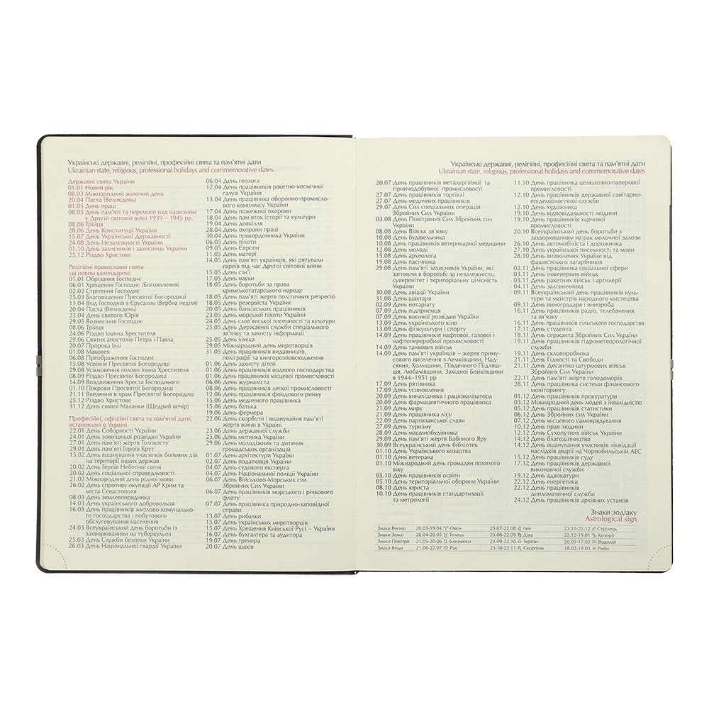 - Датована сторінка на кожен день року з організатором часу від 7:00 до 21:00, календарем на поточний/наступний місяць, позначенням дня тижня, знаку зодіаку, іменинників