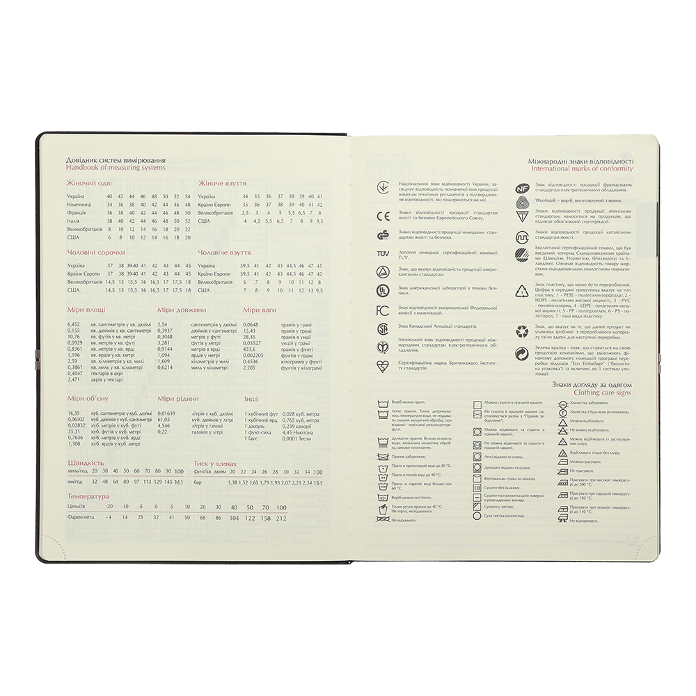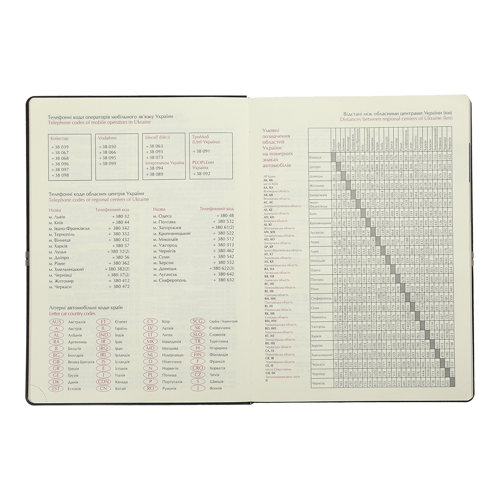 - Інформаційно-довідковий блок: національні, релігійні, професійні свята та пам’ятні дати, знаки зодіаку, телефонні коди мобільних операторів та обласних центрів України, літерні автомобільні коди країн, таблиця відстаней між обласними центрами України, довідник систем вимірювання, міжнародні знаки відповідності, знаки догляду за одягом