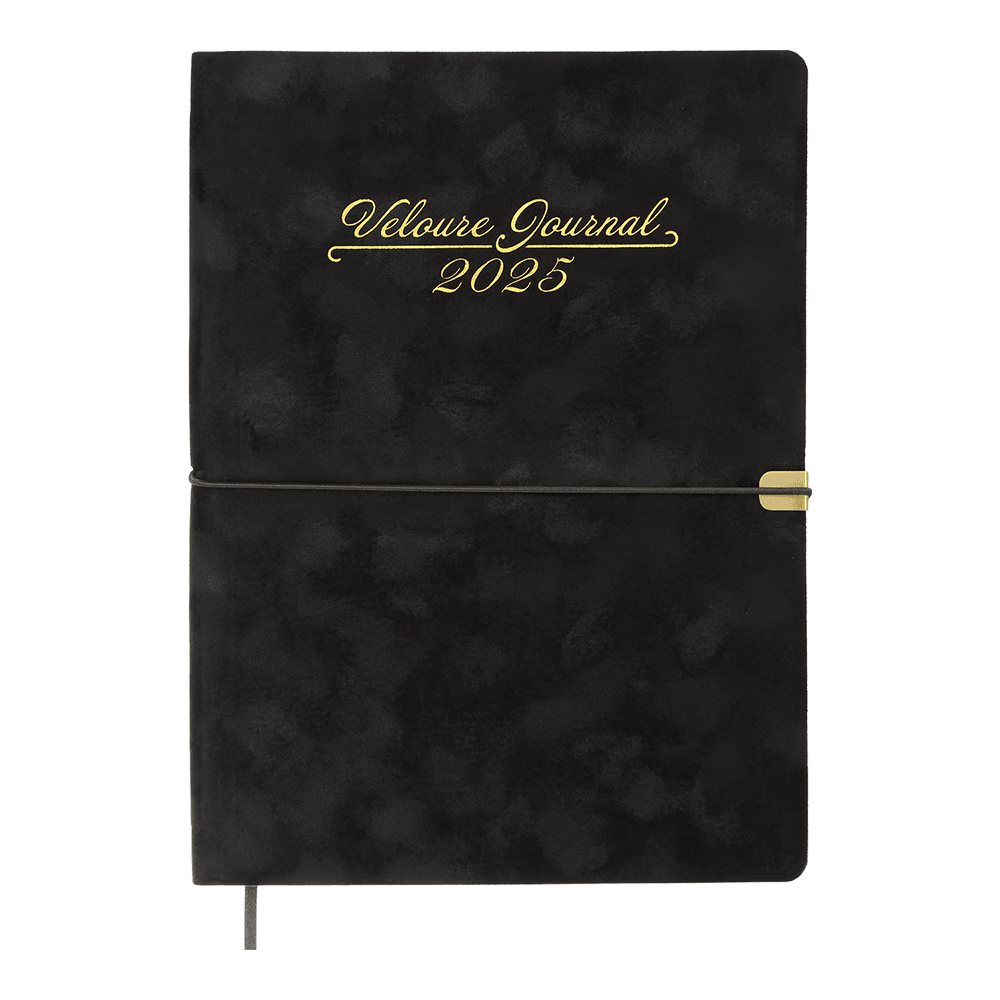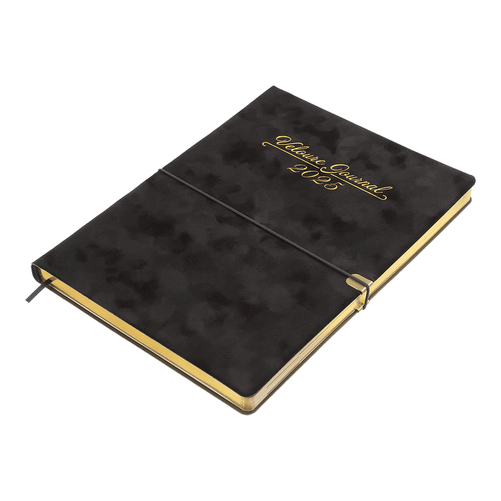 Гнучка обкладинка щоденника VELOUR виконана з штучної шкіри з виразним оксамитовим покриттям. Дві функціональні шильди на лицьовій та зворотній стороні обкладинки з поглибленнями для поперечної гумки забезпечують зручну та надійну фіксацію щоденника в закритому стані. Дизайн гармонійно доповнює та збагачує тонований золотим кольором зріз внутрішнього блоку та тиснення золотою фольгою року і напису на лицьовій стороні обкладинки.