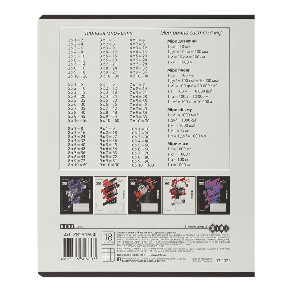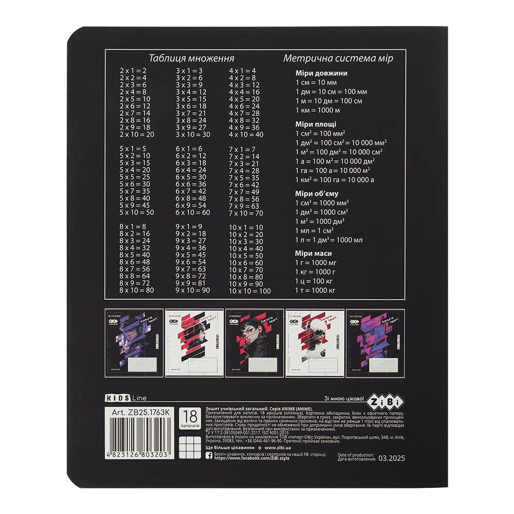 Зошит учнівський шкільний ANIME, 18арк., клітинка, KIDS LINE (відпускаються пак. 20шт/уп, 345,60грн/уп) - Характеристики