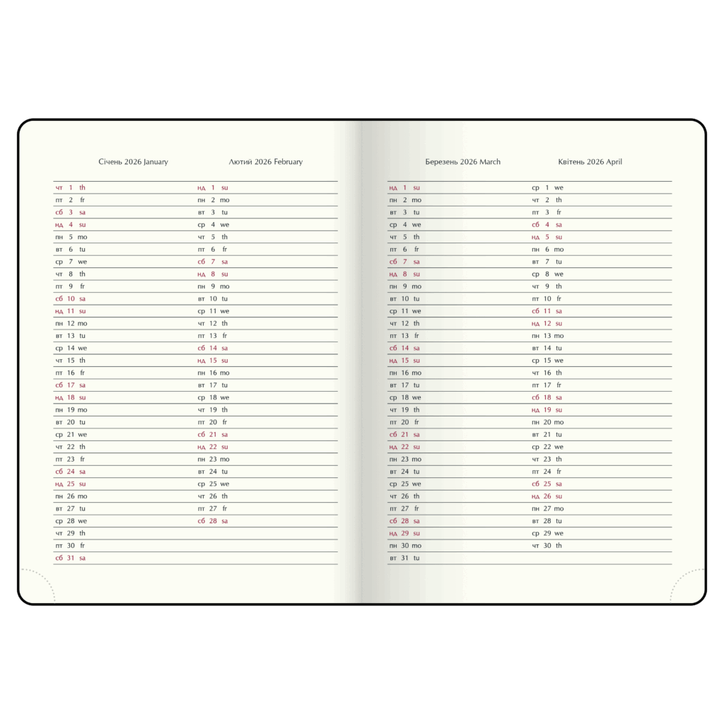 - Датована сторінка на кожен день року з організатором години від 7:00 до 21:00, календарем на поточний/наступний місяць, позначенням дня тижня, знаку зодіаку, іменинників