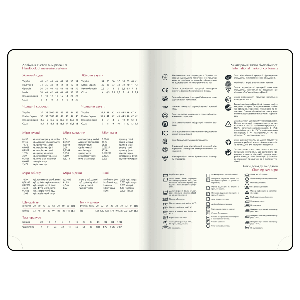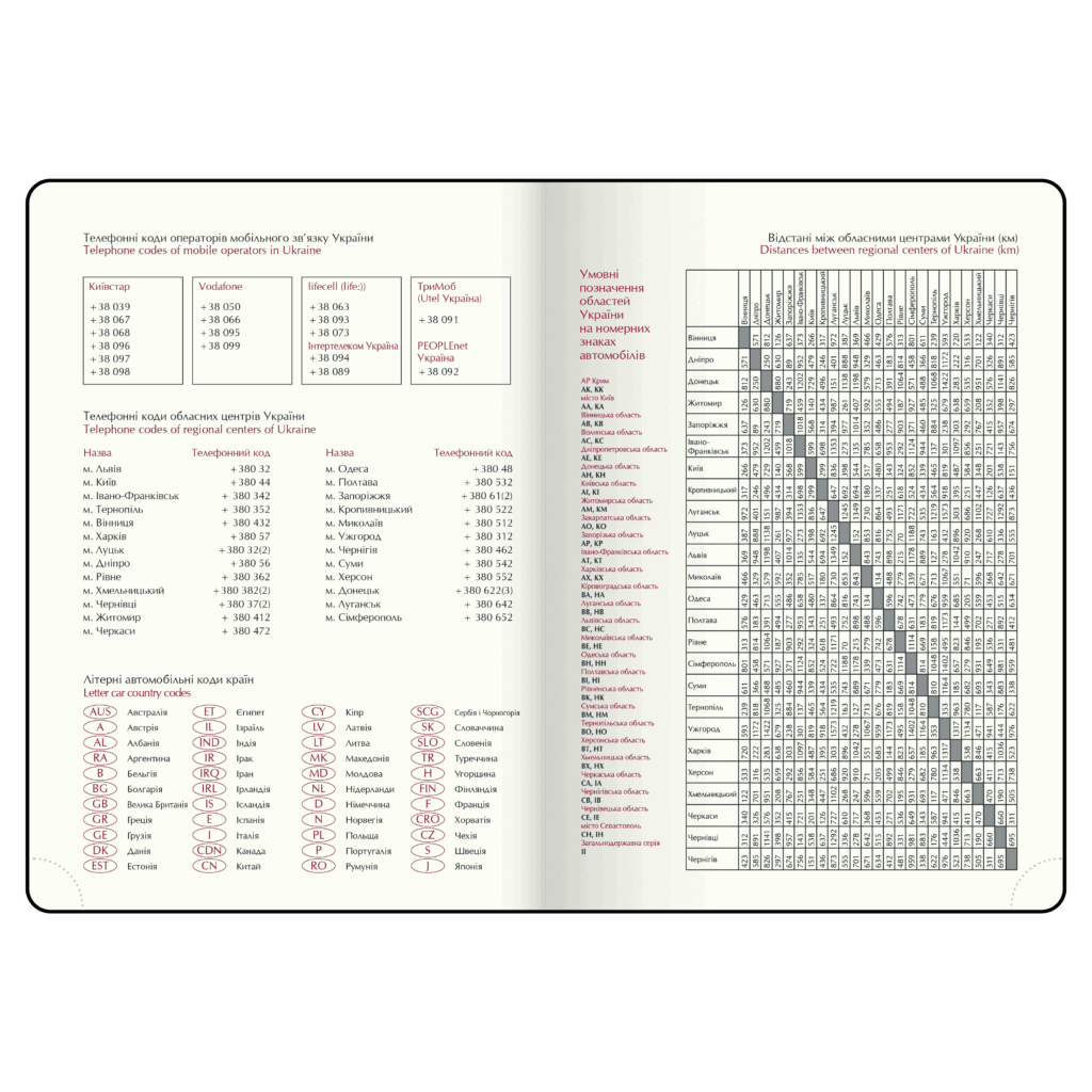 - Інформаційно-довідковий блок: національні, релігійні, професійні свята та пам’ятні дати, знаки зодіаку, телефонні коди мобільних операторів та обласних центрів України, літерні автомобільні коди країн, таблиця відстаней між обласними центрами України, довідник систем вимірювання, міжнародні знаки відповідності, знаки