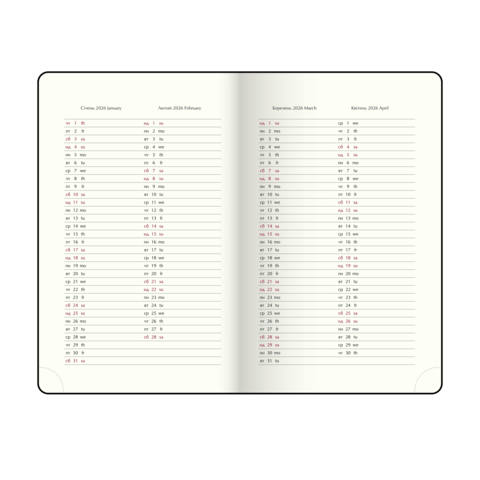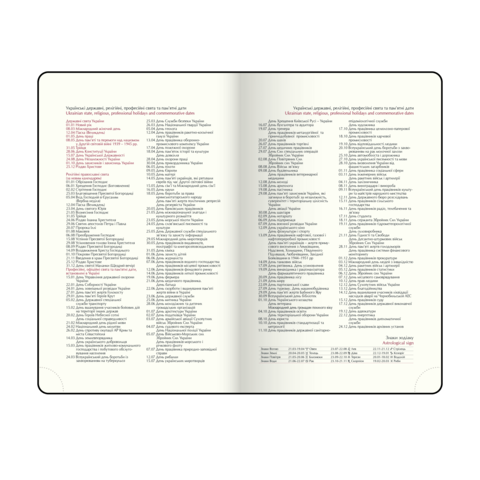 - Датована сторінка на кожен день року з організатором часу від 7:00 до 21:00, календарем на поточний/наступний місяць, позначенням дня тижня, знаку зодіаку, іменинників
