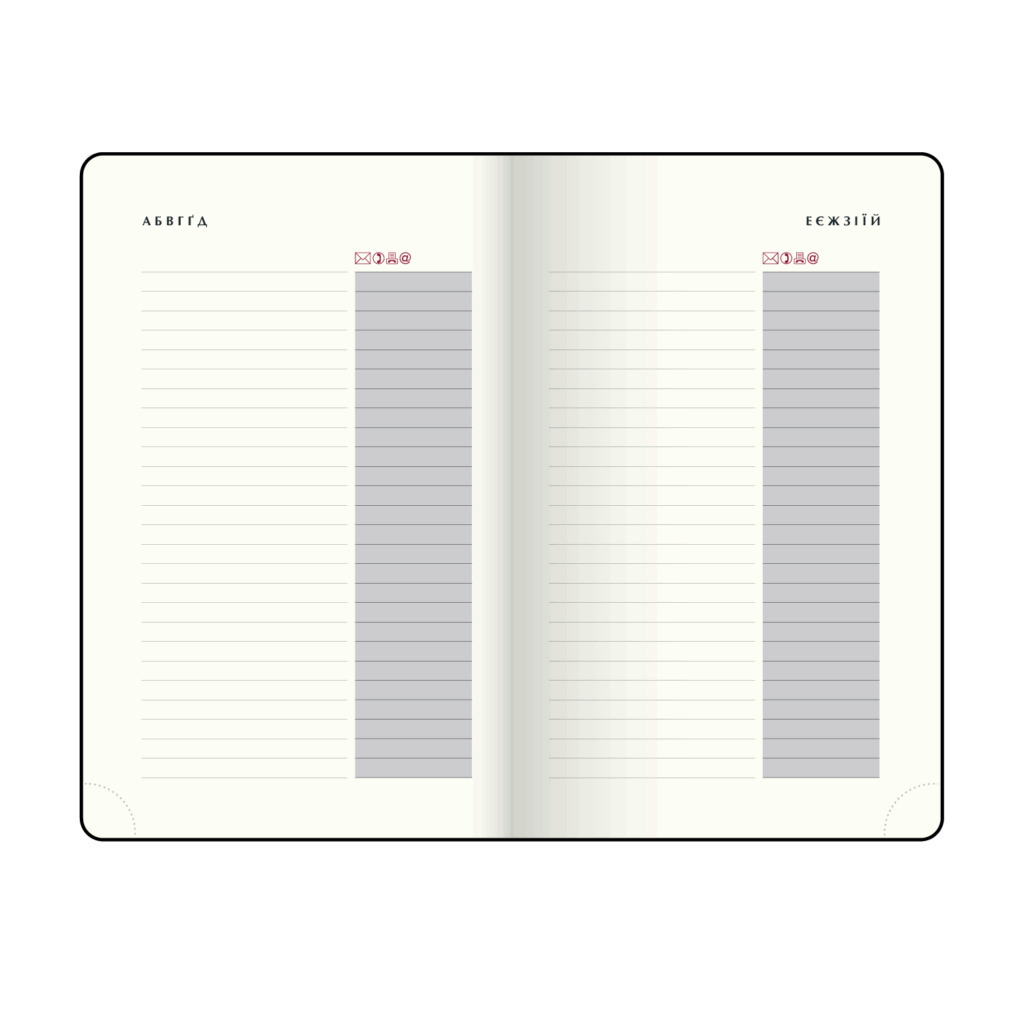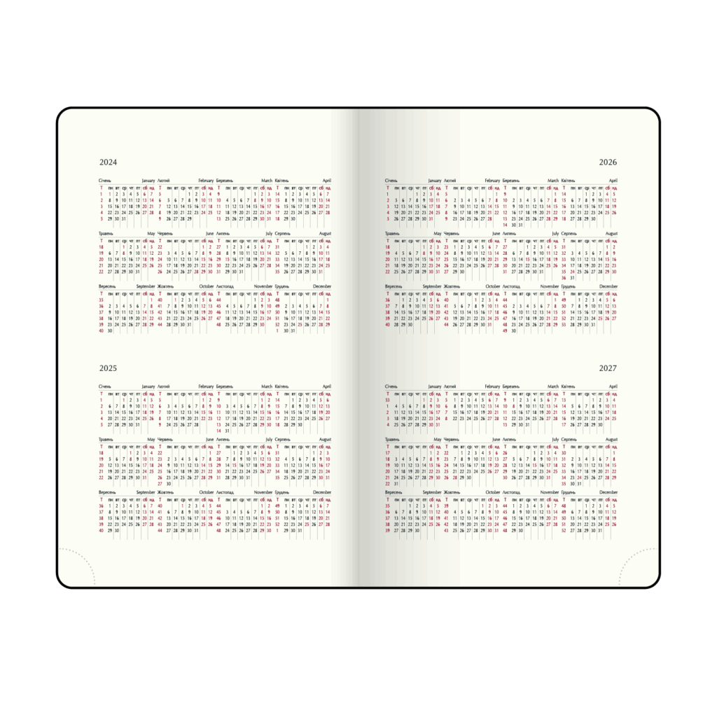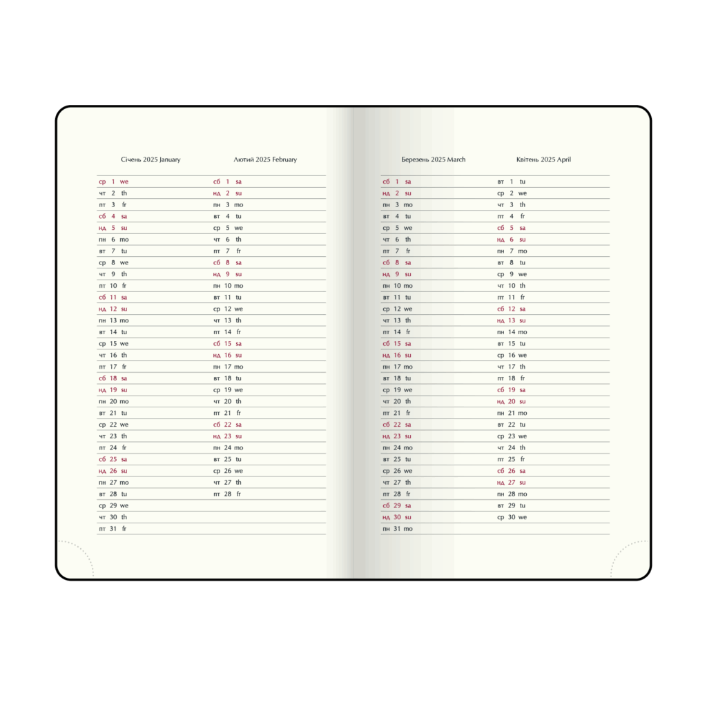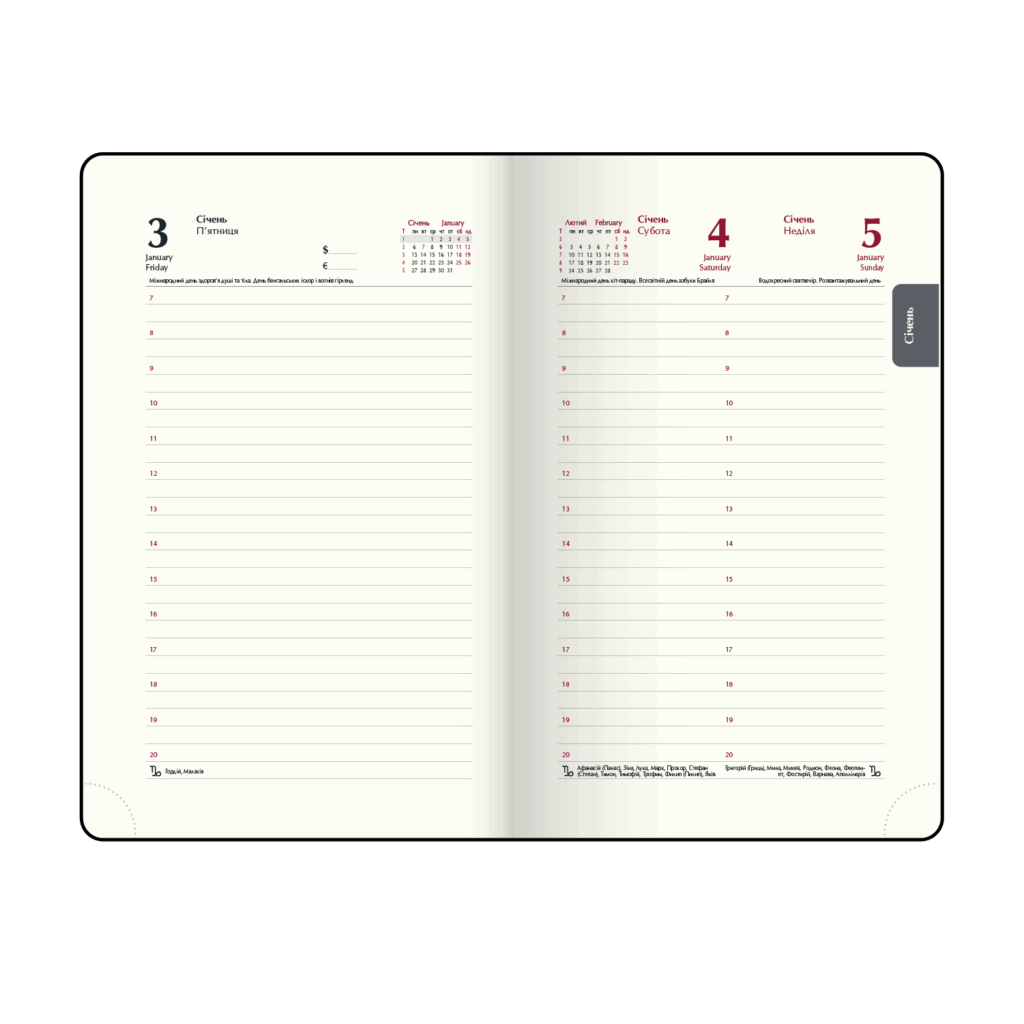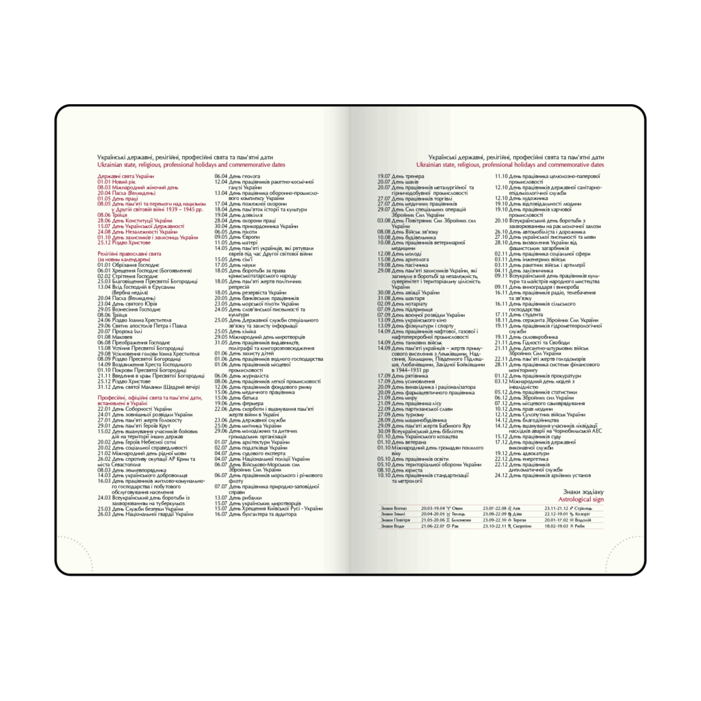 - Датована сторінка на кожен день року з організатором часу від 7:00 до 21:00, календарем на поточний/наступний місяць, позначенням дня тижня, знаку зодіаку, іменинників