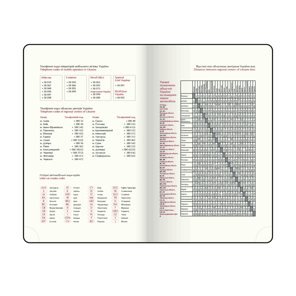 - Інформаційно-довідковий блок: національні, релігійні, професійні свята та пам’ятні дати, знаки зодіаку, телефонні коди мобільних операторів та обласних центрів України, літерні автомобільні коди країн, таблиця відстаней між обласними центрами України, довідник систем вимірювання, міжнародні знаки відповідності, знаки догляду за одягом